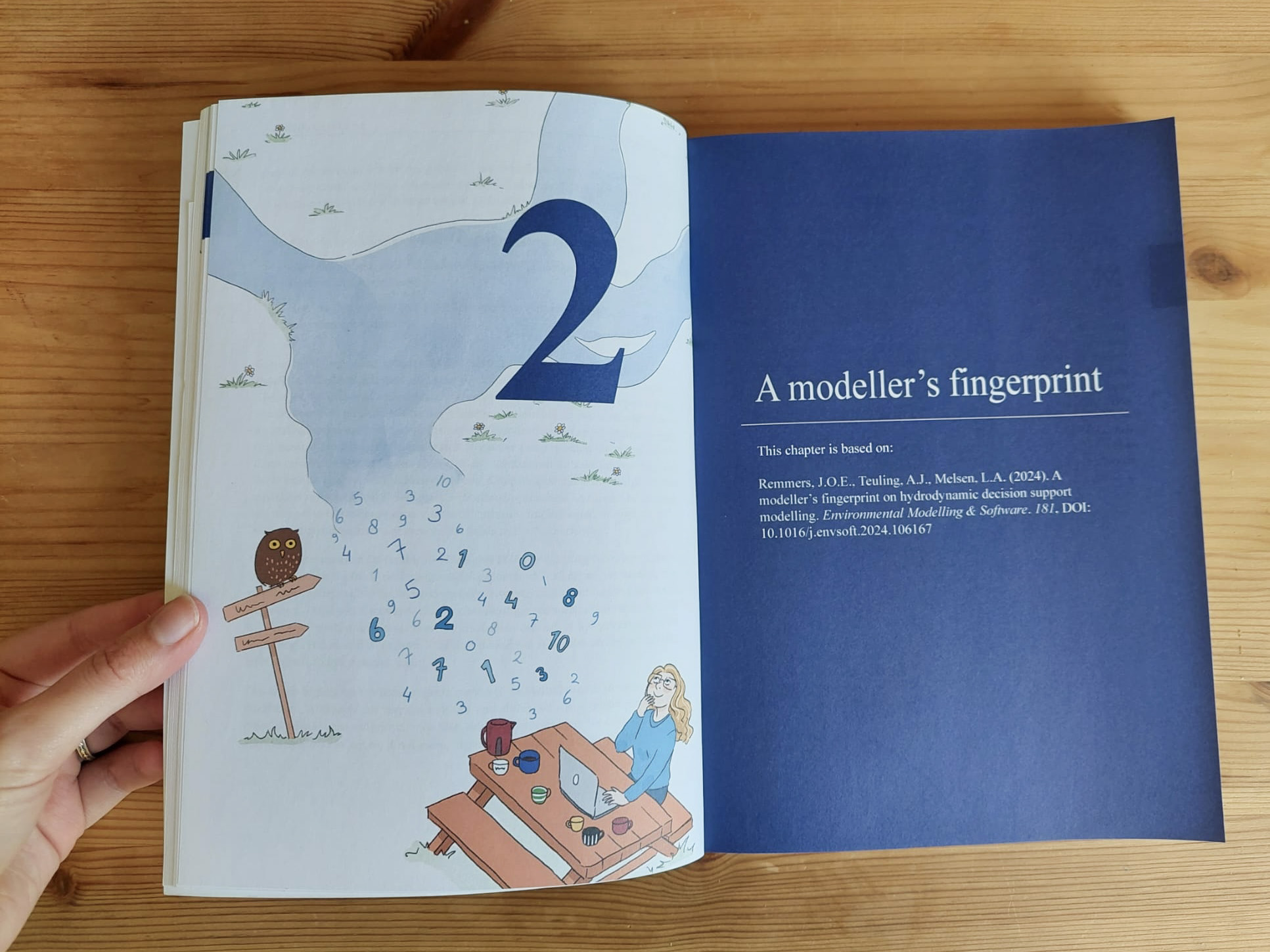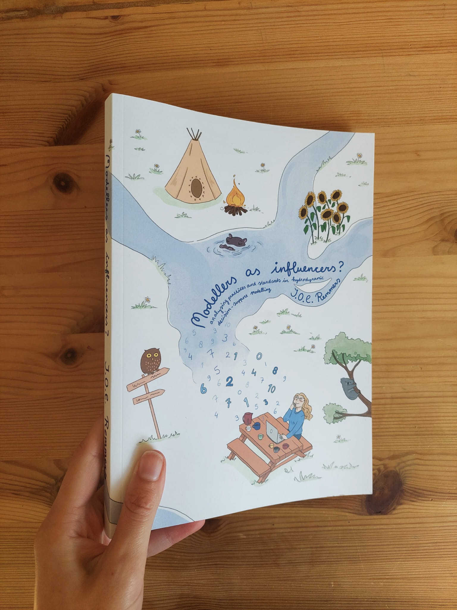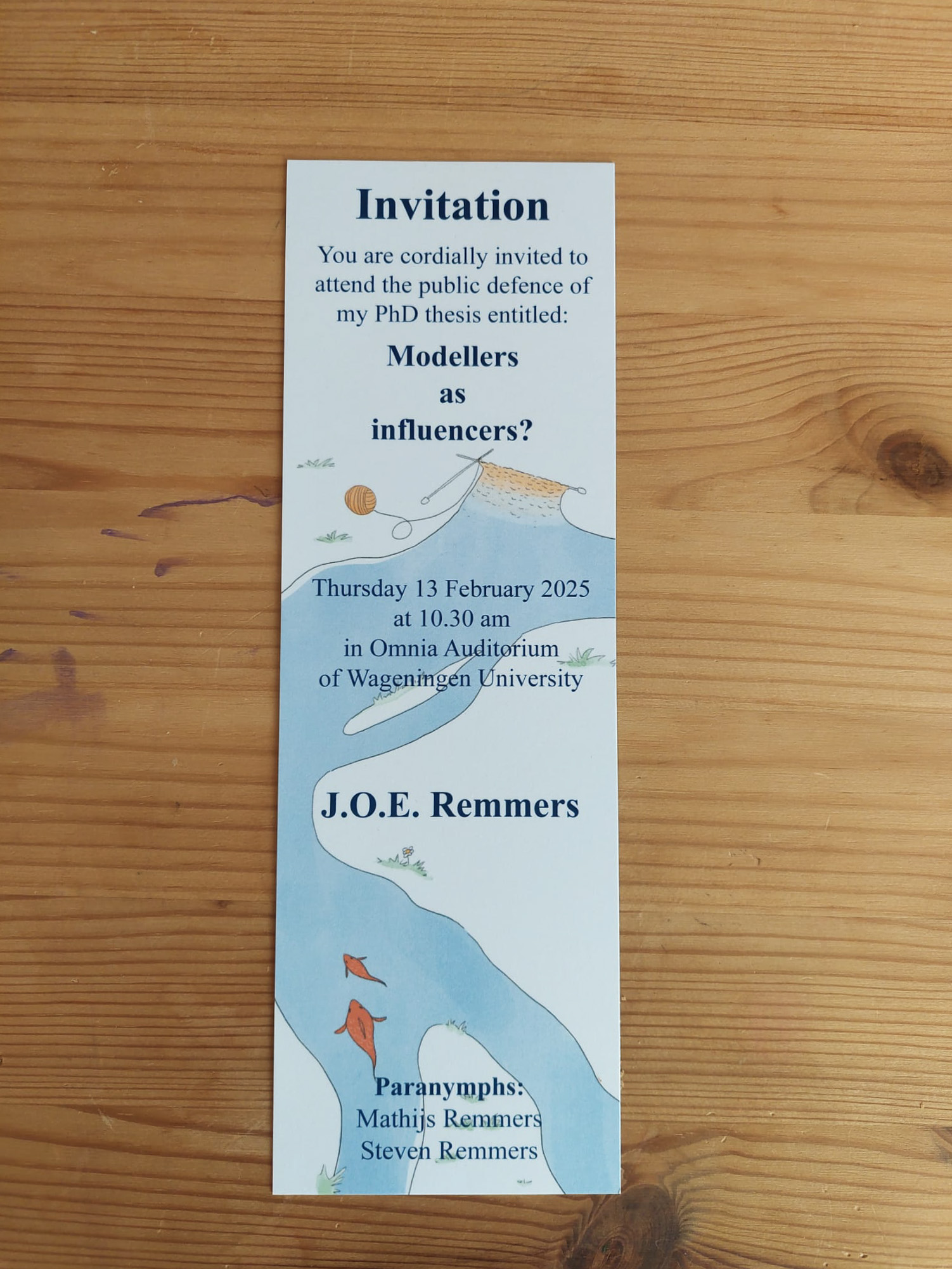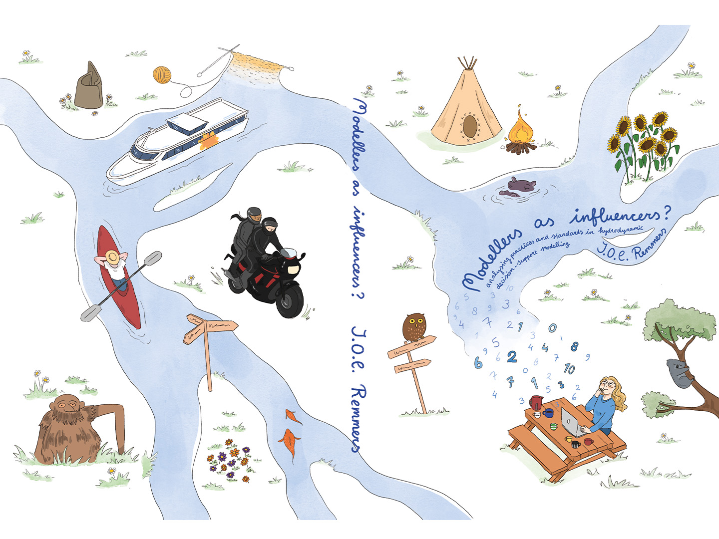 I designed and illustrated a cover and title pages for the thesis of Janneke Remmers named “Modellers as influencers”? We also added a bookmark that doubled as the invitation to her thesis defence. The illustrations are al connected to childhood memories or important events in her life and research.